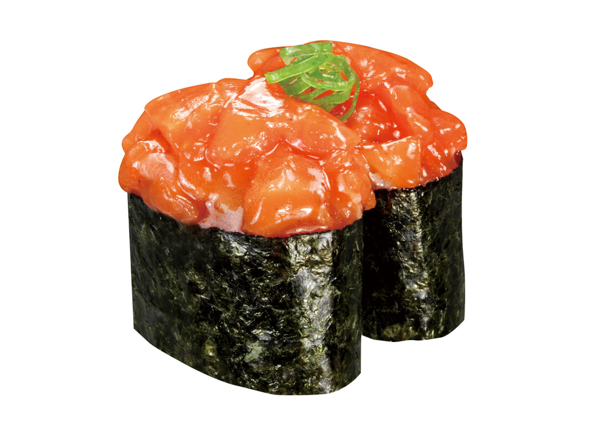 ぶつ切りにしたサーモンのごろっとした食感と、甘辛いユッケだれが食欲をそそる一品。