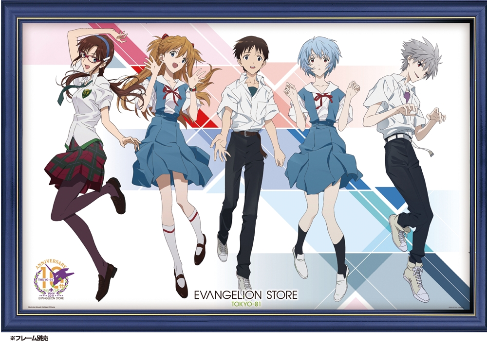 「碇シンジ」を中心に、5人のパイロットが制服姿で集合。
