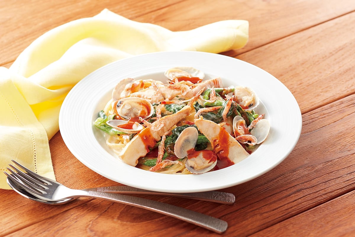 ガーリックオイルで炒めた菜の花とあさり、香ばしく揚げたシャキシャキ食感の筍をクリームソースに絡めた、具だくさんのクリームパスタです。