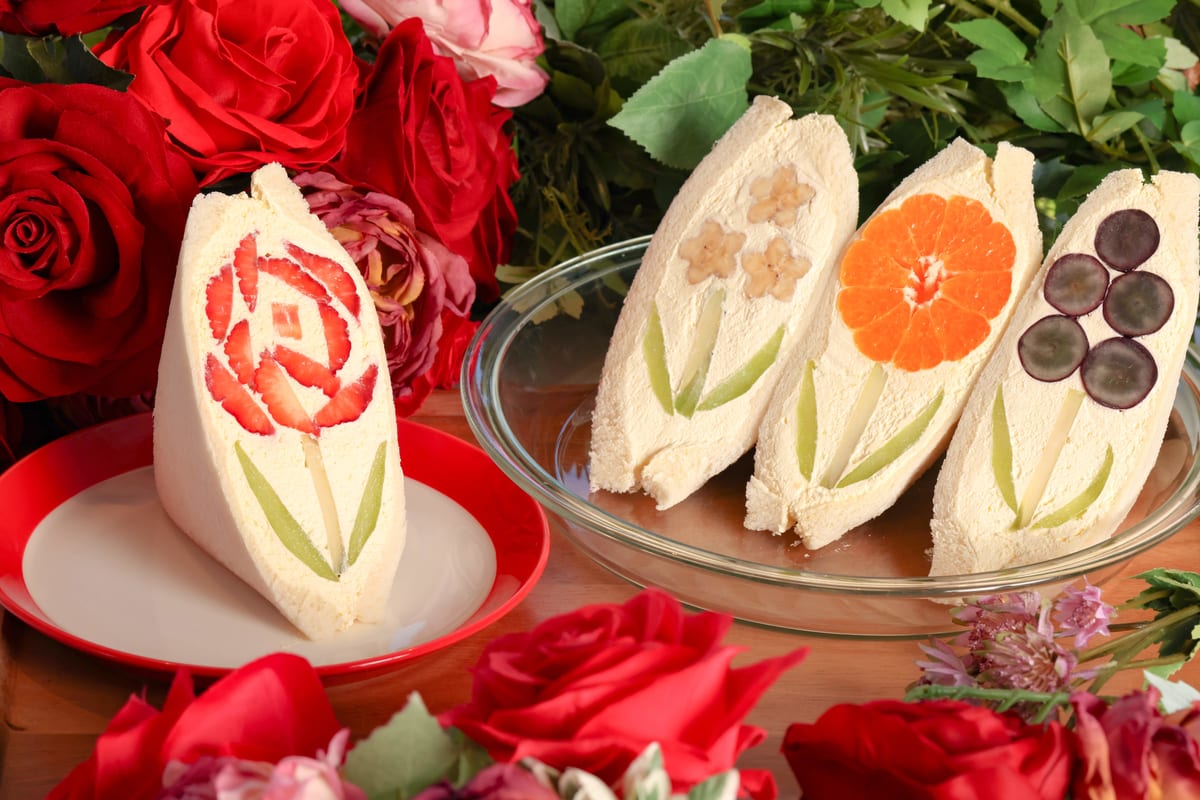 旬のフルーツを使用したフルーツサンドは、お花をモチーフにした華やかな断面。
