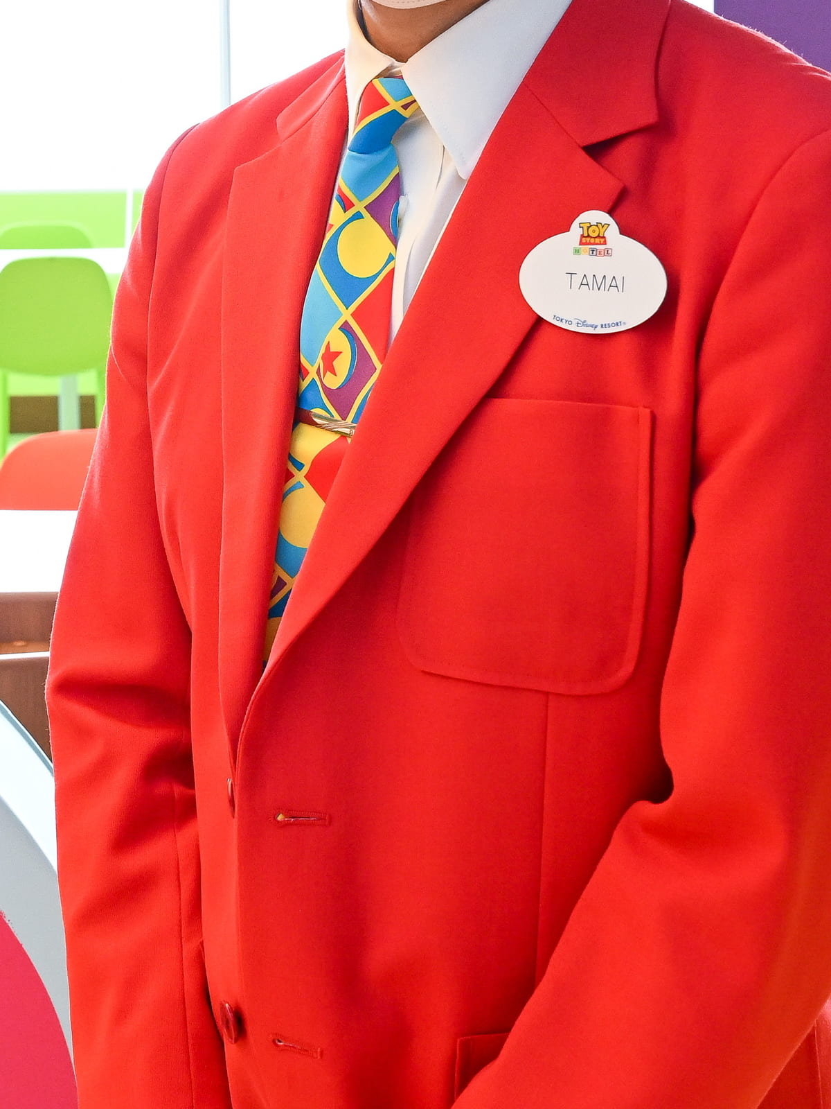 カラフルなピクサーボール柄のネクタイがおしゃれなキャストのコスチュームにも注目です。