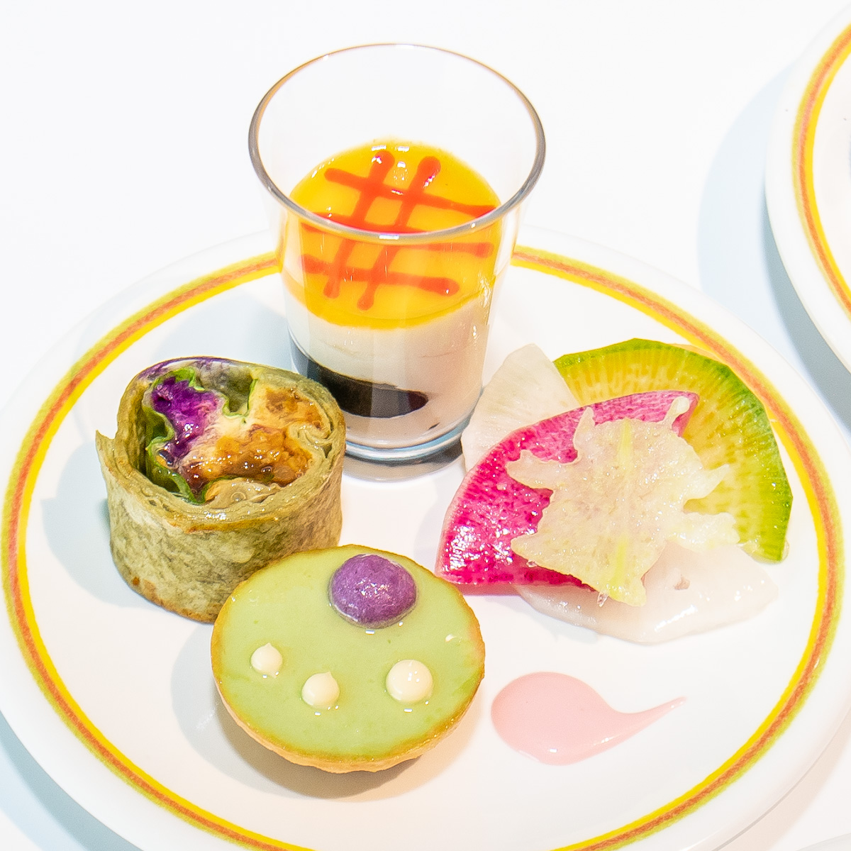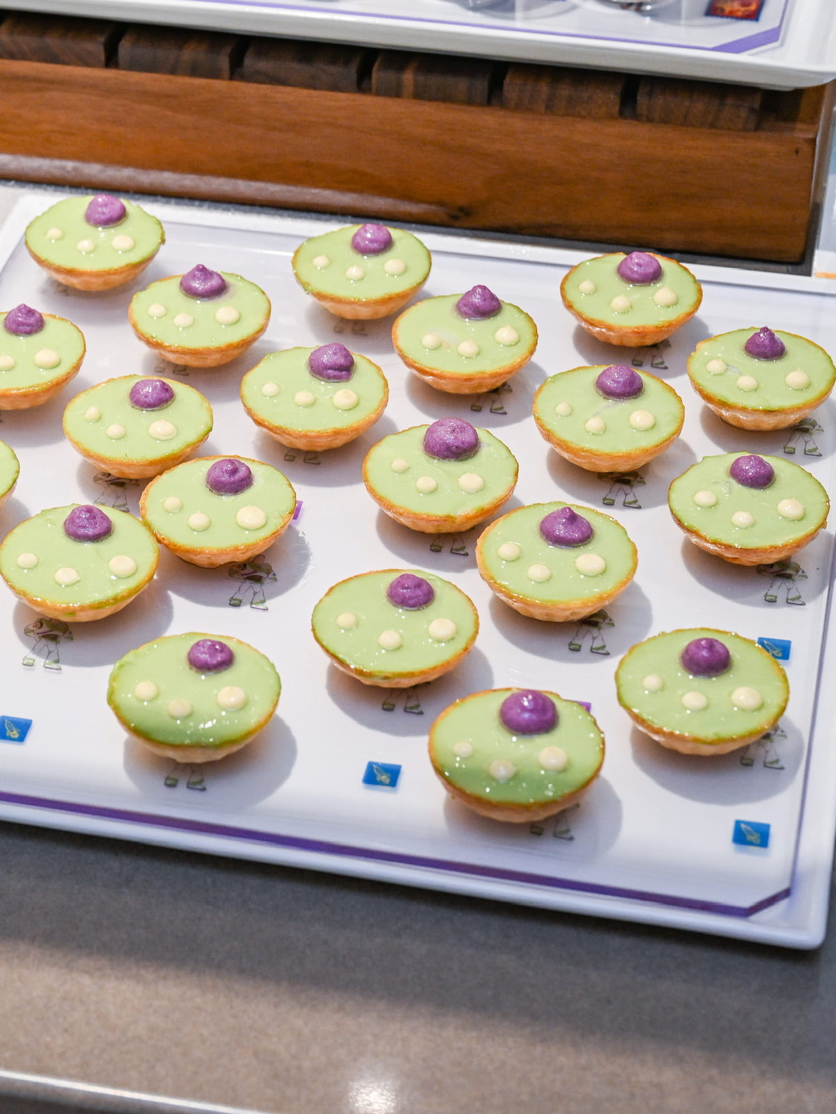 バズ・ライトイヤーをイメージした、ポテトとグリーンピースのピュレの層に、紫芋のムースがトッピングされたタルト。