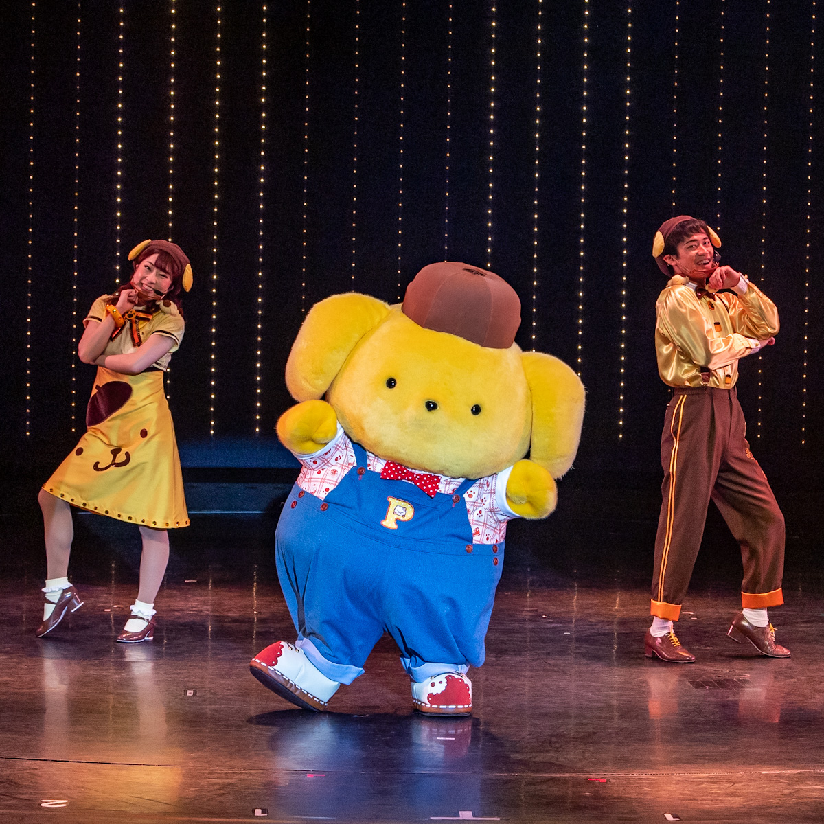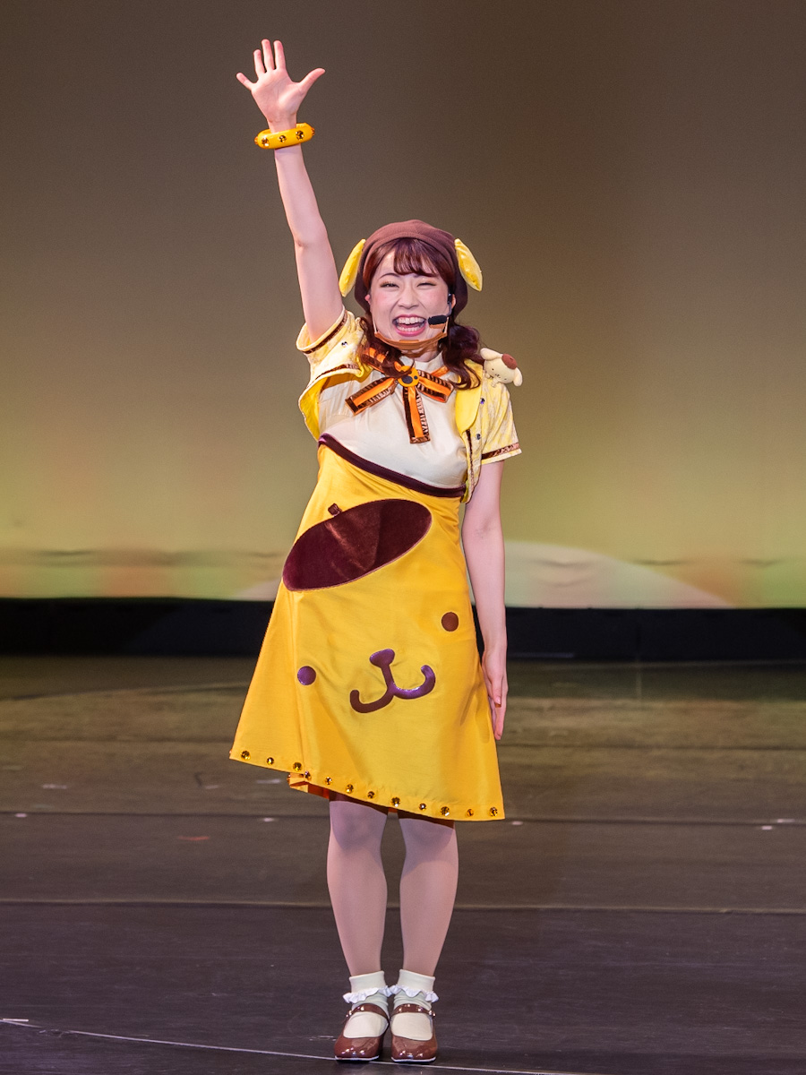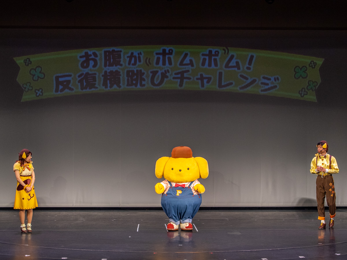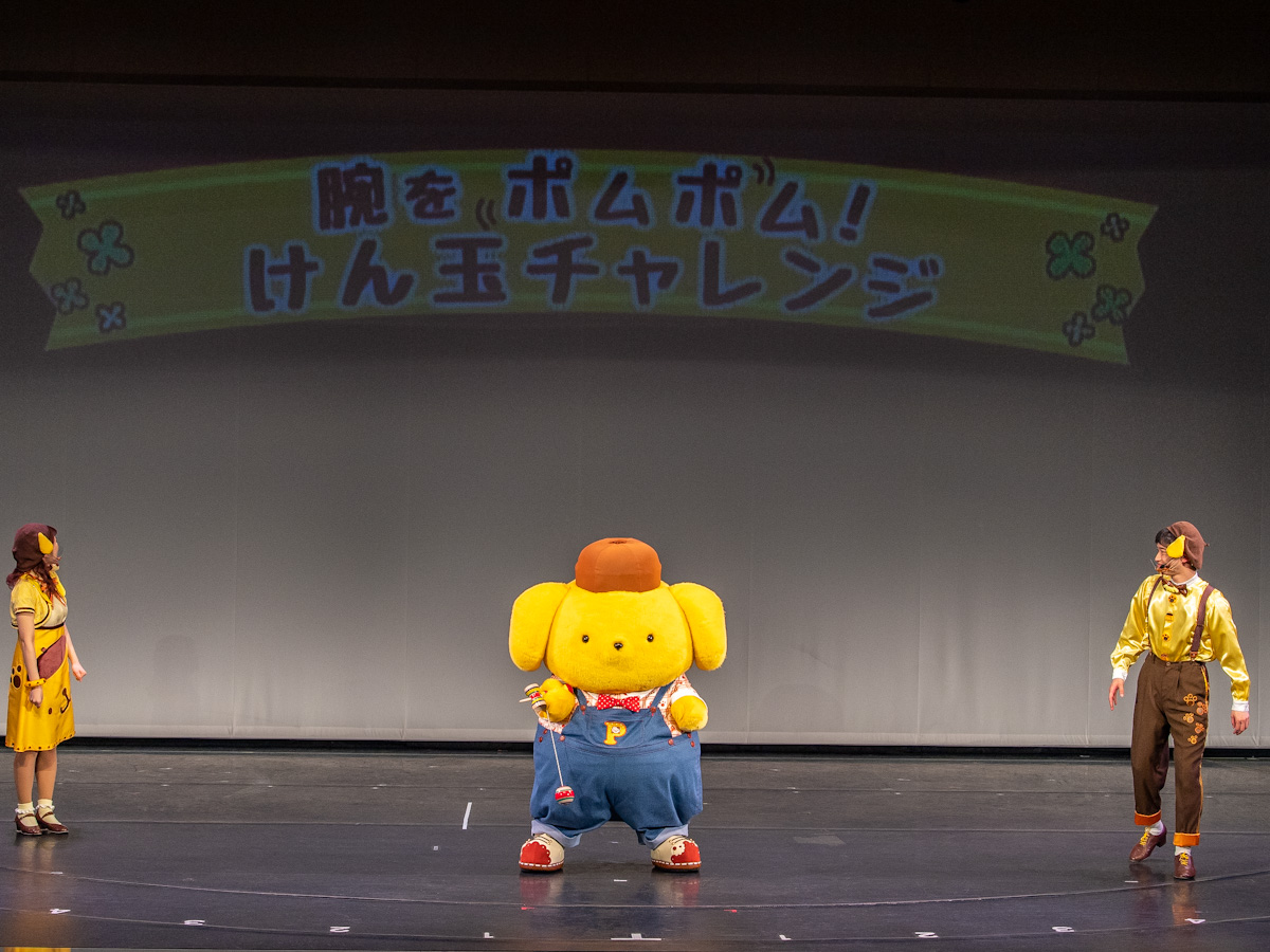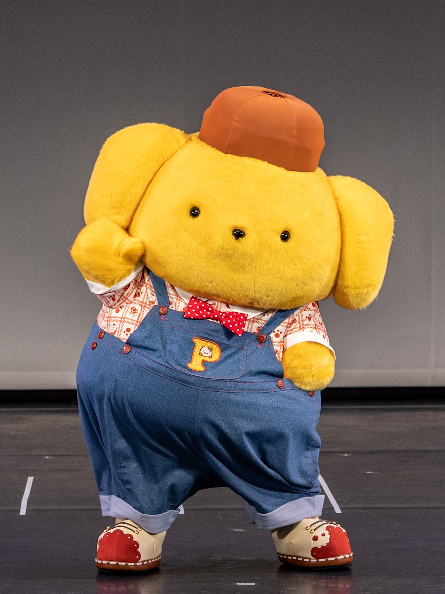 ステージの幕が上がると、ストライプ柄のベストがかわいいポムポムプリンが登場!