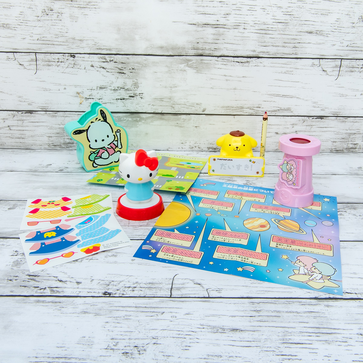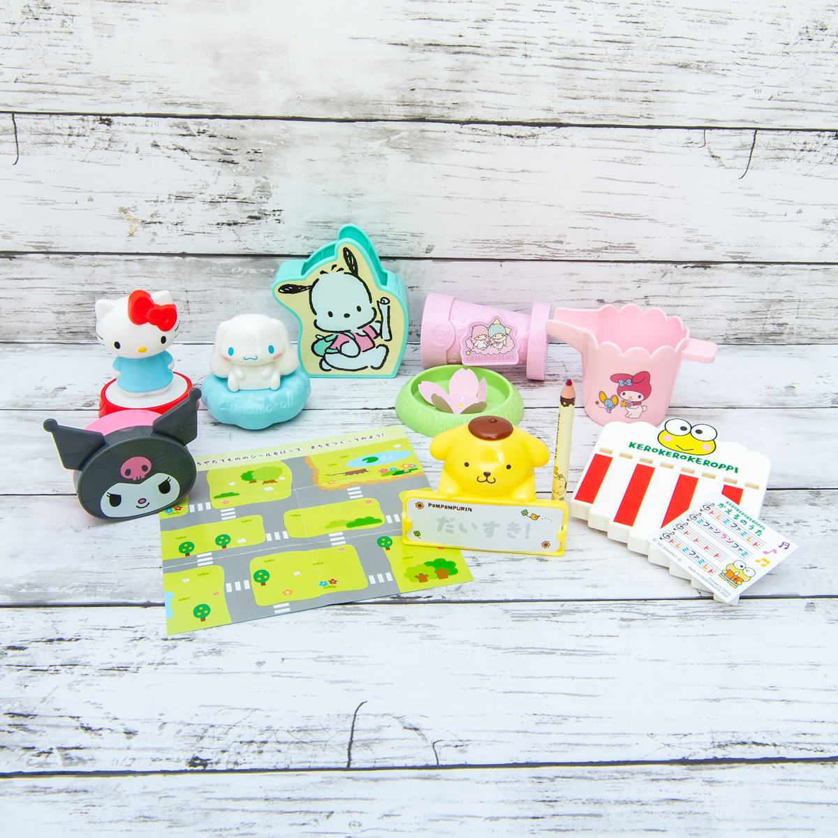 「ハローキティ」や「ポムポムプリン」「マイメロディ」たちの、可愛いグッズがおもちゃとして登場。