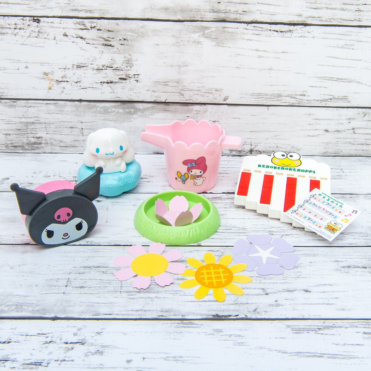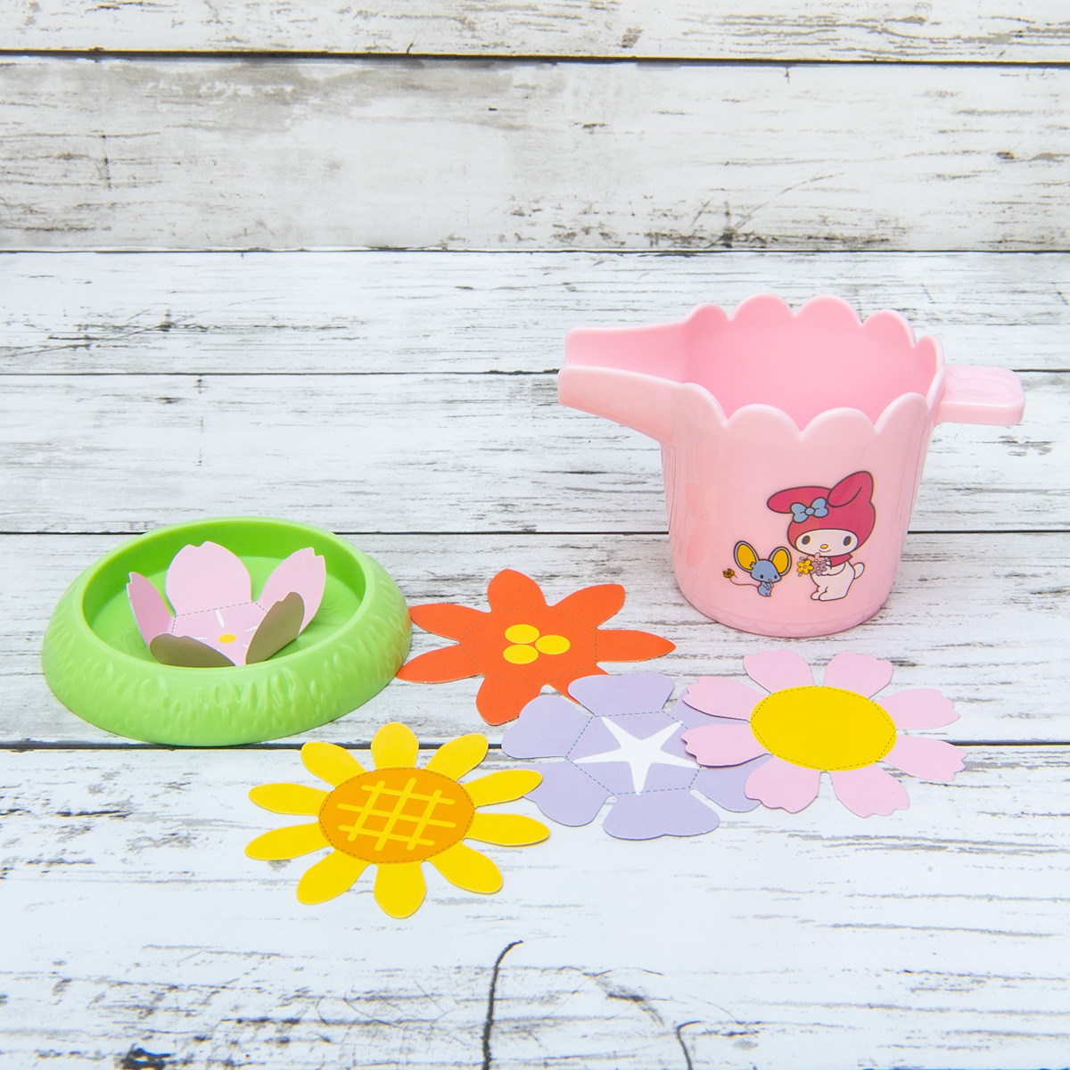 花を折りたたんでセットし、「マイメロディ」のジョウロで水をかけると、花びらが開くおもちゃ。