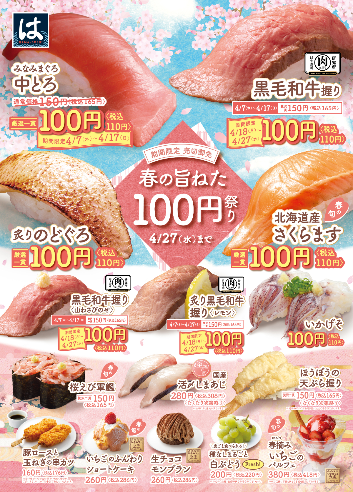 はま寿司「春の旨ねた100円祭り」は、2022年4月7日(木)から4月27日(水)までの開催です。