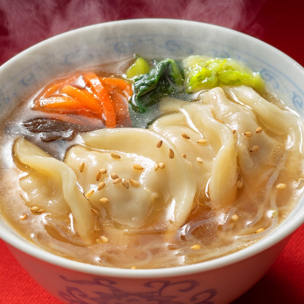 つるもち皮とクワイの食感が美味しい餃子入り春雨スープ。