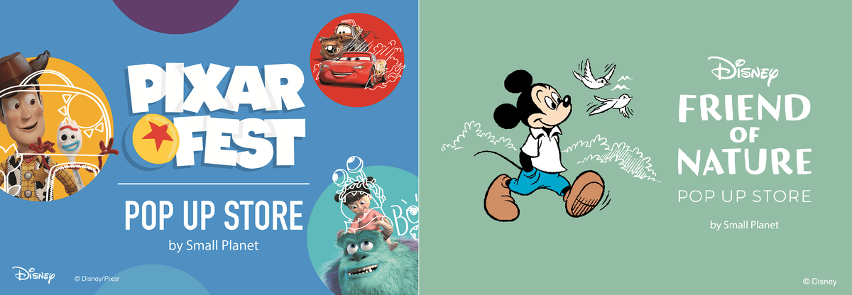 小田急百貨店新宿店本館1階の特設会場にて同時開催される「PIXAR FEST POP UP STORE by Small Planet」と「Disney FRIEND OF NATURE POP UP STORE by Small Planet」