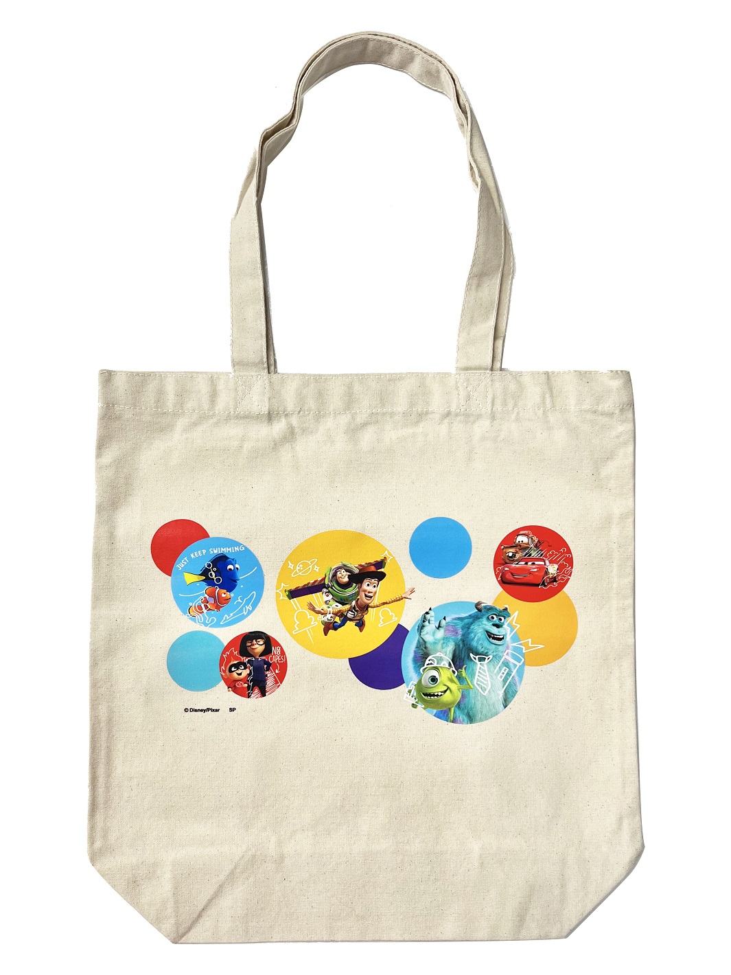 カラフルな水玉模様に「トイ・ストーリー」や「ファインディング・ニモ」「モンスターズ・インク」「カーズ」「Mr.インクレディブル」のキャラクターたちをプリントしたトートバッグ。