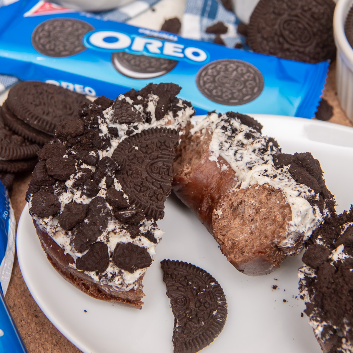 ほんのりチョコ味のリングに、コクのあるなめらかなホワイトクリームをのせ、オレオクッキーのクラムがしきつめてあります。
