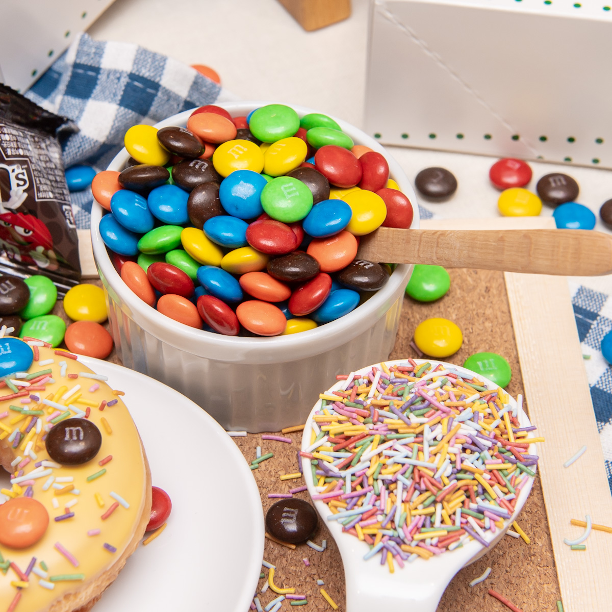 ”m”のマークでおなじみのアイコニックなチョコと、パリッとした食感が楽しいスプリンクルでデコレーションしてあります。