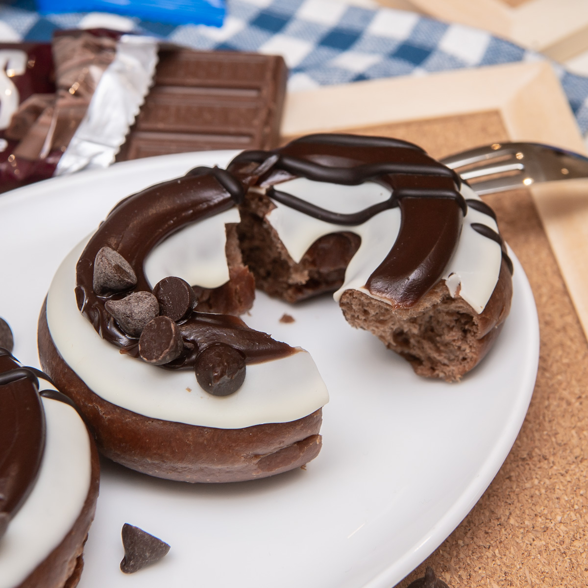 チョコ生地のドーナツに、ミルキーなホワイトチョコを重ね、甘さ控えめのチョコクリームとビターチョコのラインを描いています。