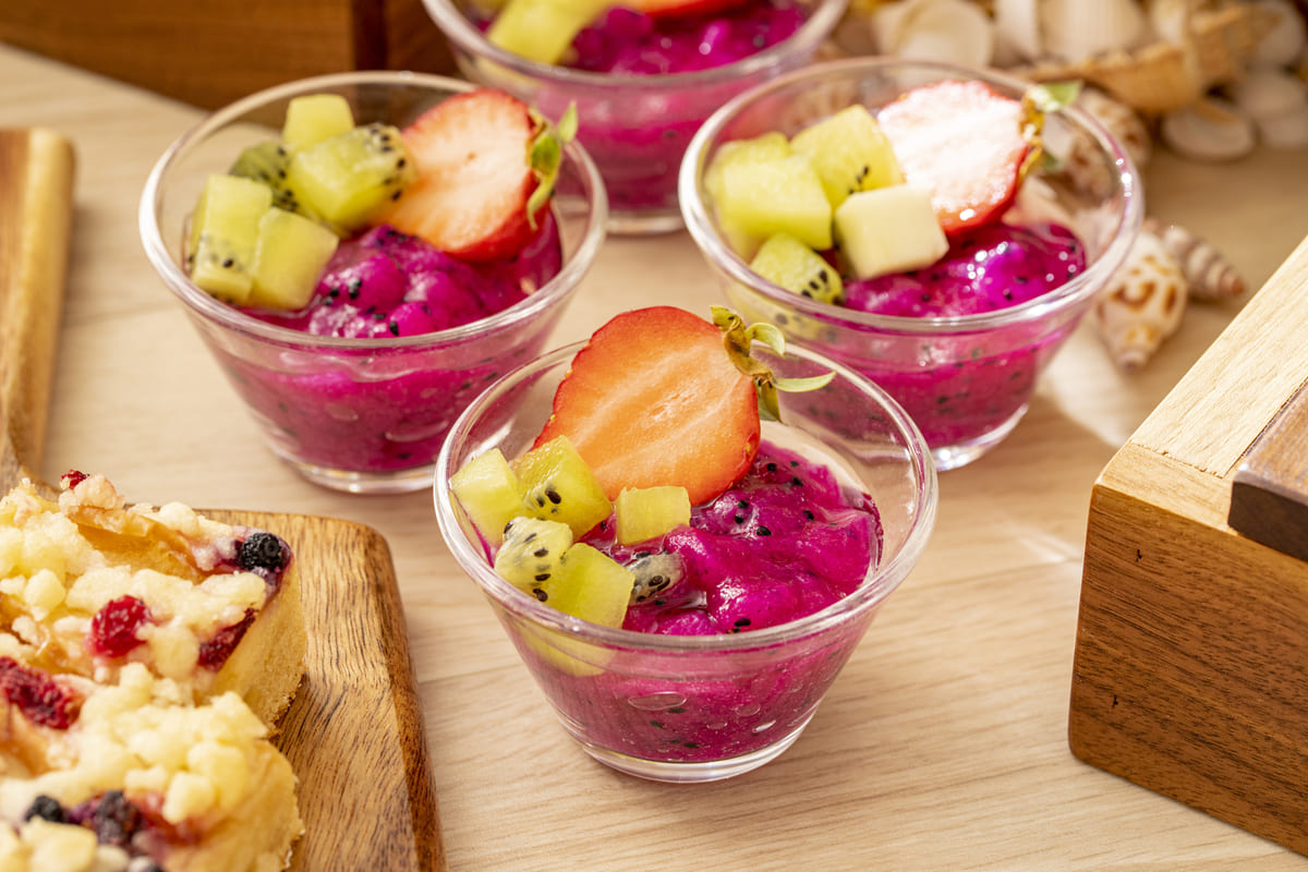 スーパーフードのピタヤ(ドラゴンフルーツ)のゼリーの上に、ピタヤのピューレが重ねられた、キウイといちごをトッピング。