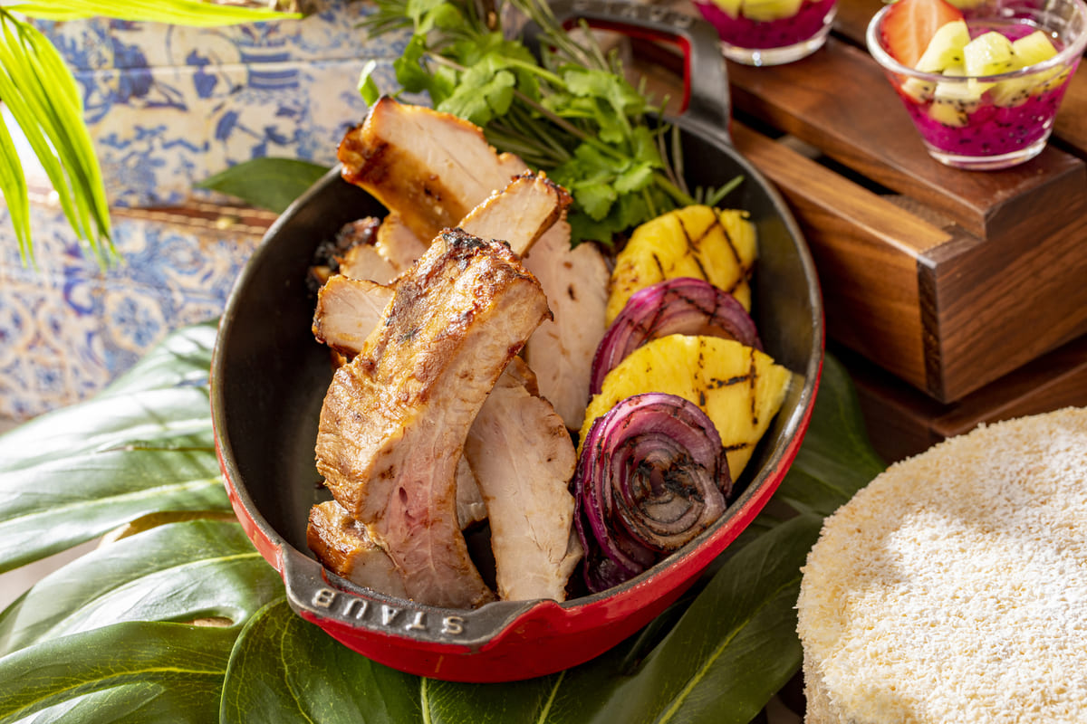 ポークバックリブを丸ごとマリネし、オーブンで香ばしく焼き上げ、フルーティーなマンゴーソースでいただくスペアリブ。