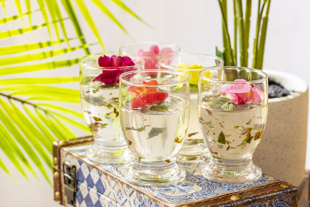 ミントの葉を透明なゼリーに散らし、エディブルフラワーが飾られています。