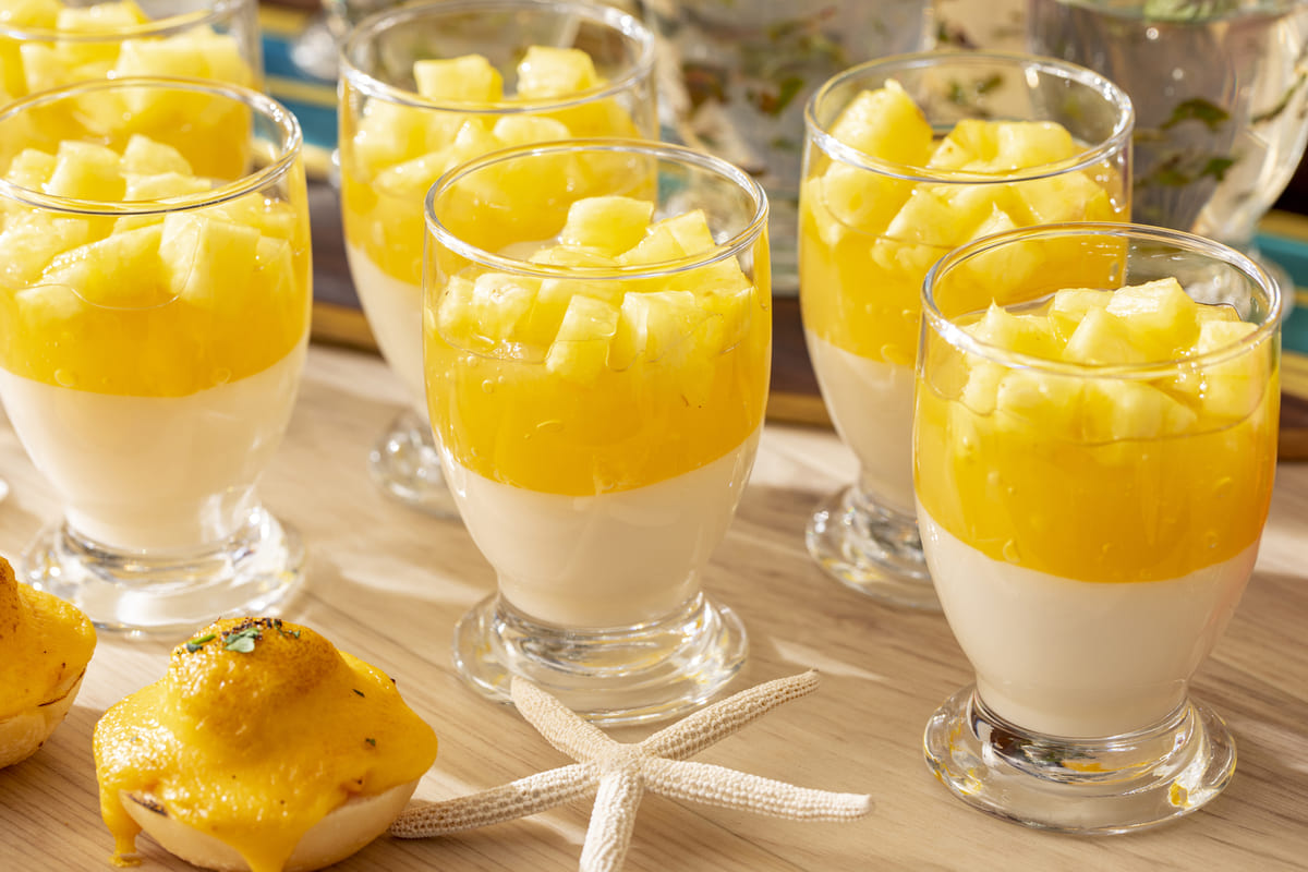 ココナッツミルクのゼリーの上にパイナップルのゼリーと、果肉を重ねたカクテルのような華やかなグラスデザート。