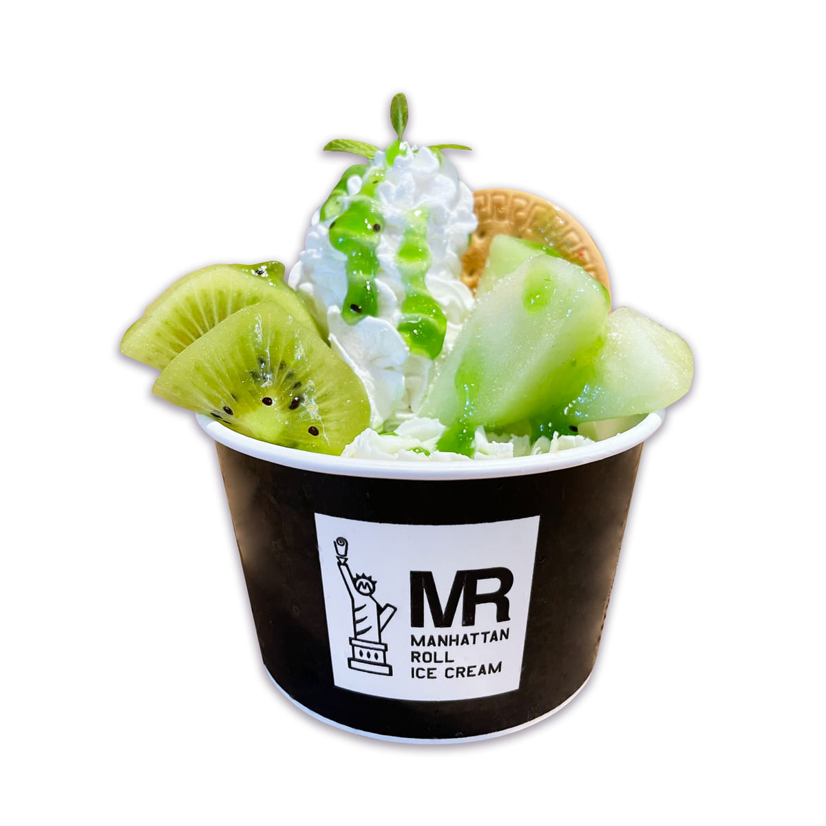 ほのかに酸味のあるキウイと冷凍メロンをトッピングし、キウイソースをかけたアイスクリームです。