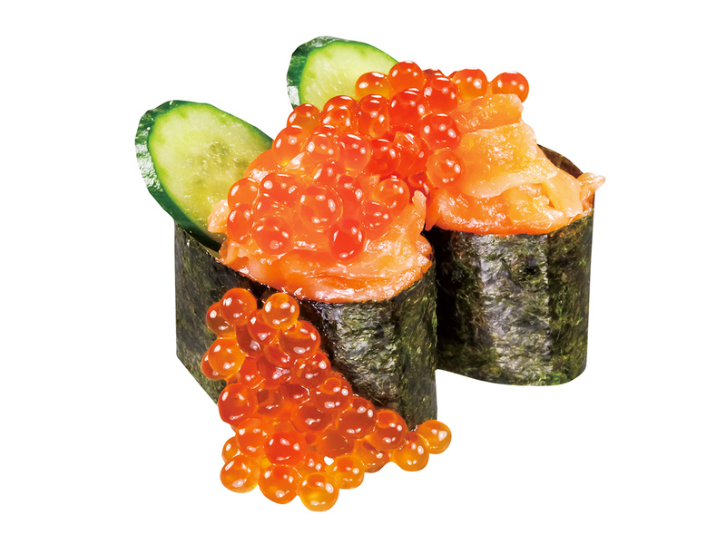 脂乗りのよいサーモンとともにいくらを堪能できる、海鮮親子丼のような軍艦巻です!