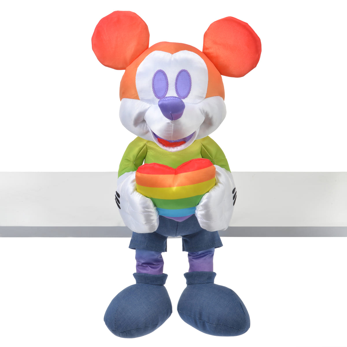 夢や希望のメッセージを感じるレインボーカラーで仕上げられた「ミッキーマウス」のぬいぐるみ。