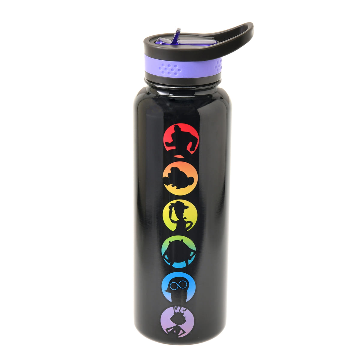 ディズニー&ピクサーキャラクターたちがシルエットでプリントされた、大容量タイプのウォーターボトル。