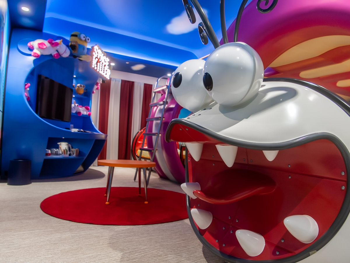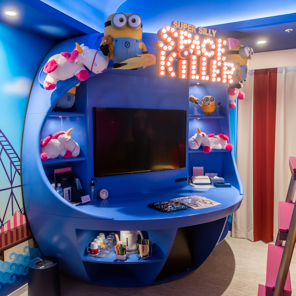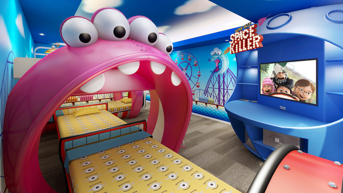 映画『怪盗グルーの月泥棒』で登場した遊園地「スーパー・シリー・ファンランド」をホテルの客室で表現した楽しい空間になっています☆