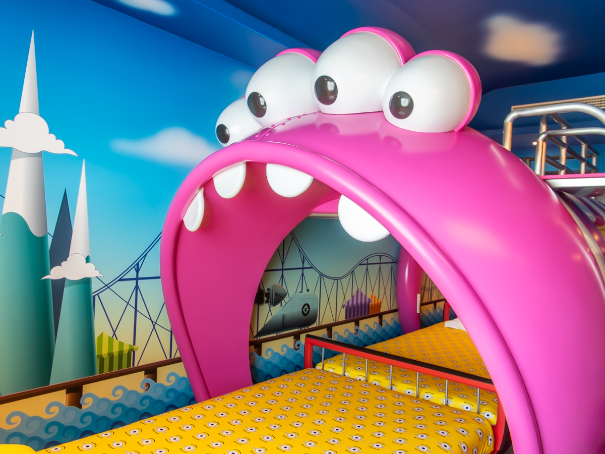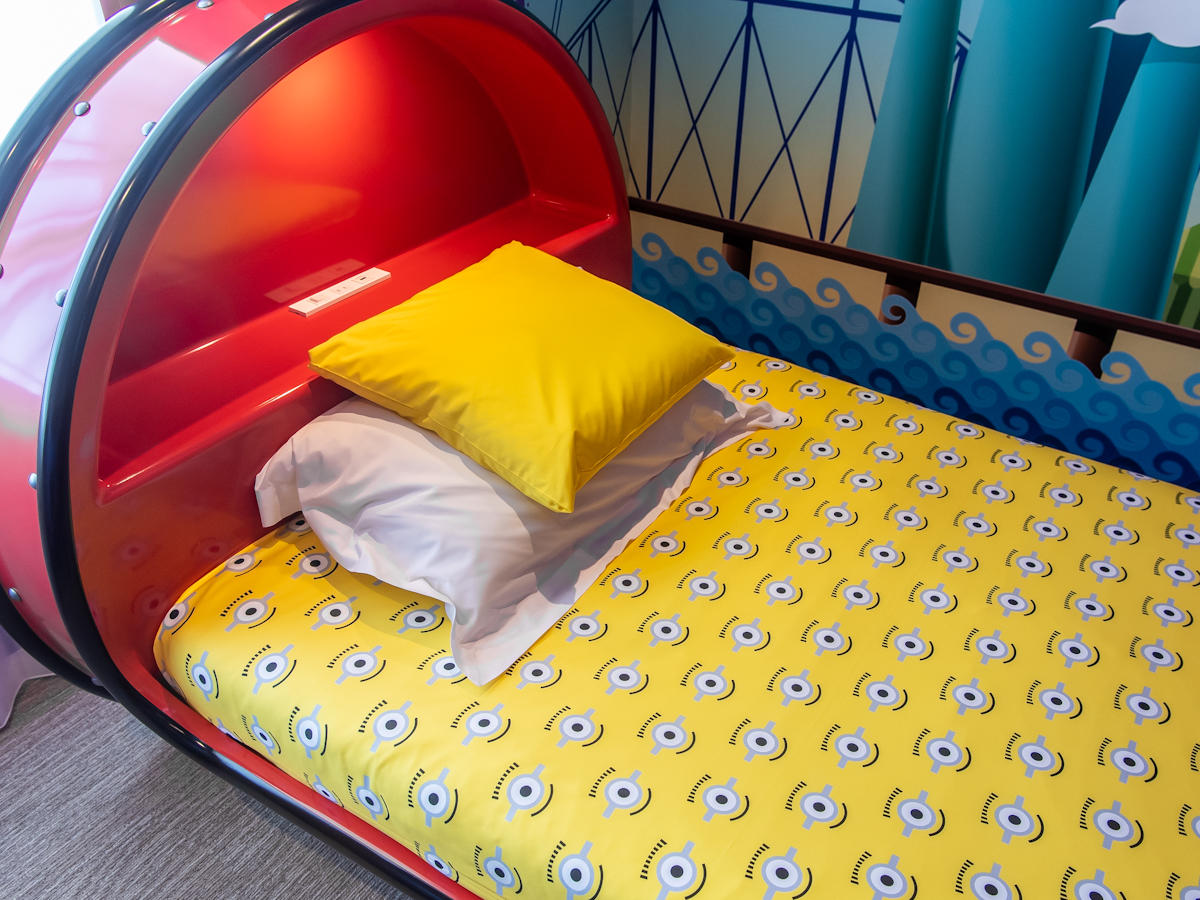 「ミニオンルーム 3 ~思い出の遊園地『スーパー・シリー・ファンランド』~」の最大の見どころは、映画『怪盗グルーの月泥棒』に登場する、クリーチャーのジェットコースターの姿をしたユニークな2段ベッド。