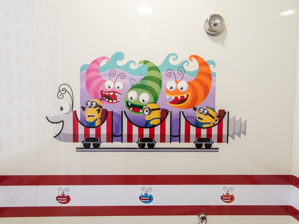 壁面に描かれた遊園地の風景には、キャラクターたちが隠れているのもポイント。