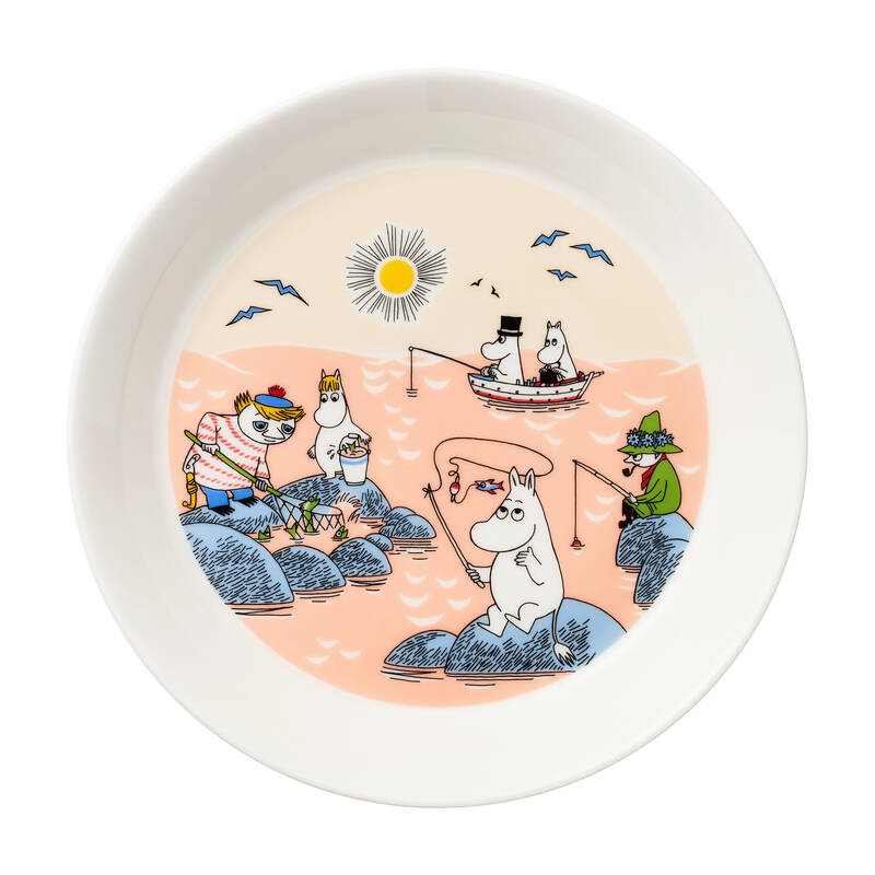 海で思い思いに釣りを楽しむ「ムーミン」たちが描かれたプレート。