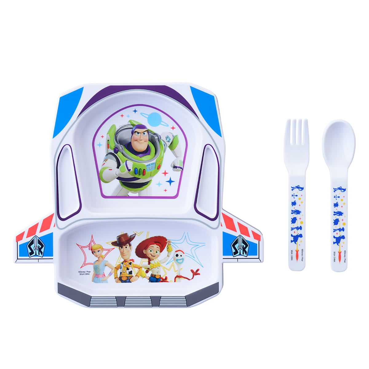 「トイ・ストーリー」のキャラクターたちがプリントされた、賑やかで楽しい宇宙船型のプレートセット。
