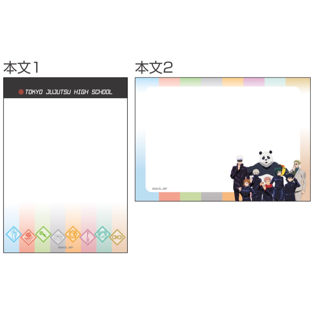 本文は、表紙をアレンジしたタテ向き無地柄、一年3人をカラフルにデザインしたタテ向きヨコ罫柄、人間を起源とする呪い「真人」と最悪の呪詛師「夏油傑」のふたりを左右に配したヨコ向きヨコ罫柄、二年生3人をデザインしたヨコ向きヨコ罫柄の全4柄!