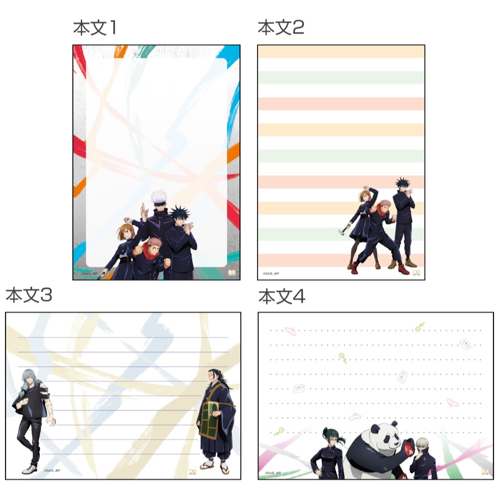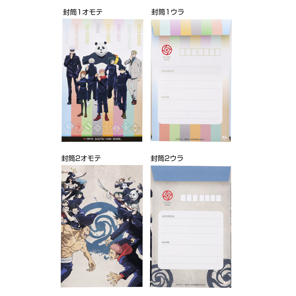 Aデザインのレターセットは、便せん・封筒共に、「虎杖悠仁」「伏黒恵」「釘崎野薔薇」「五条悟」らメインキャラクター4人の柄。