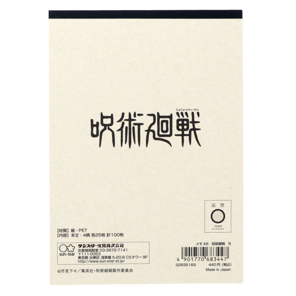「虎杖悠仁」「伏黒恵」「釘崎野薔薇」「五条悟」の4人が表紙になったAデザインのメモA6。