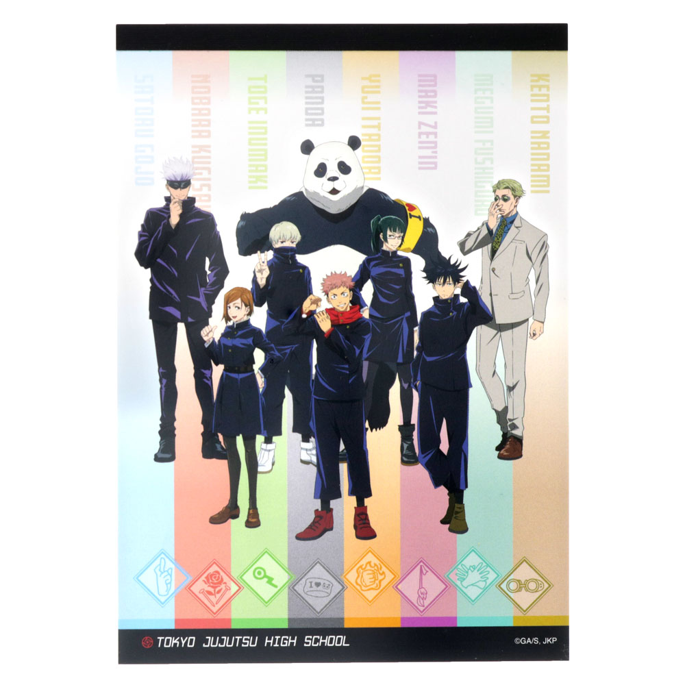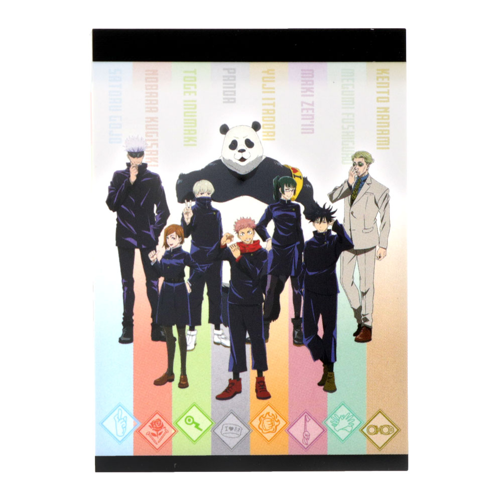 「虎杖悠仁」「伏黒恵」「釘崎野薔薇」「禪院真希」「狗巻棘」「パンダ」「七海建人」「五条悟」らが大集合したBデザインのメモミニ。
