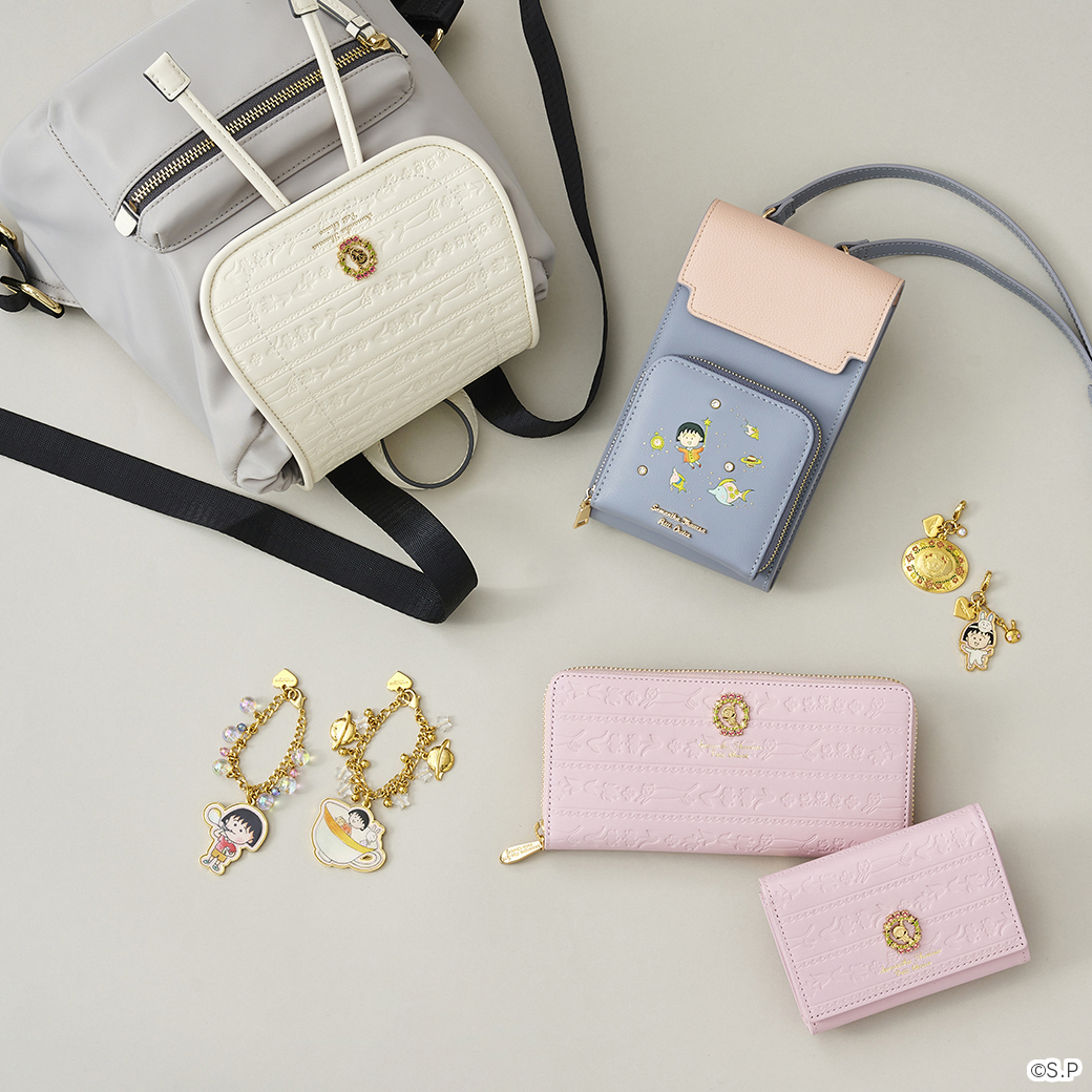 リュックやお財布には、星のステッキを持って飛んでいる「まる子」モチーフの金具がキラリと輝きます。