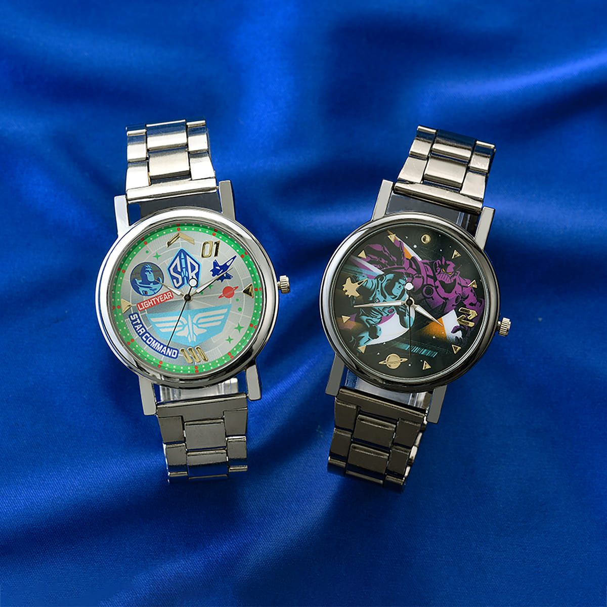 シルバーのリストウォッチは、スペース・レンジャー「バズ・ライトイヤー」をイメージしたモチーフがたっぷり。