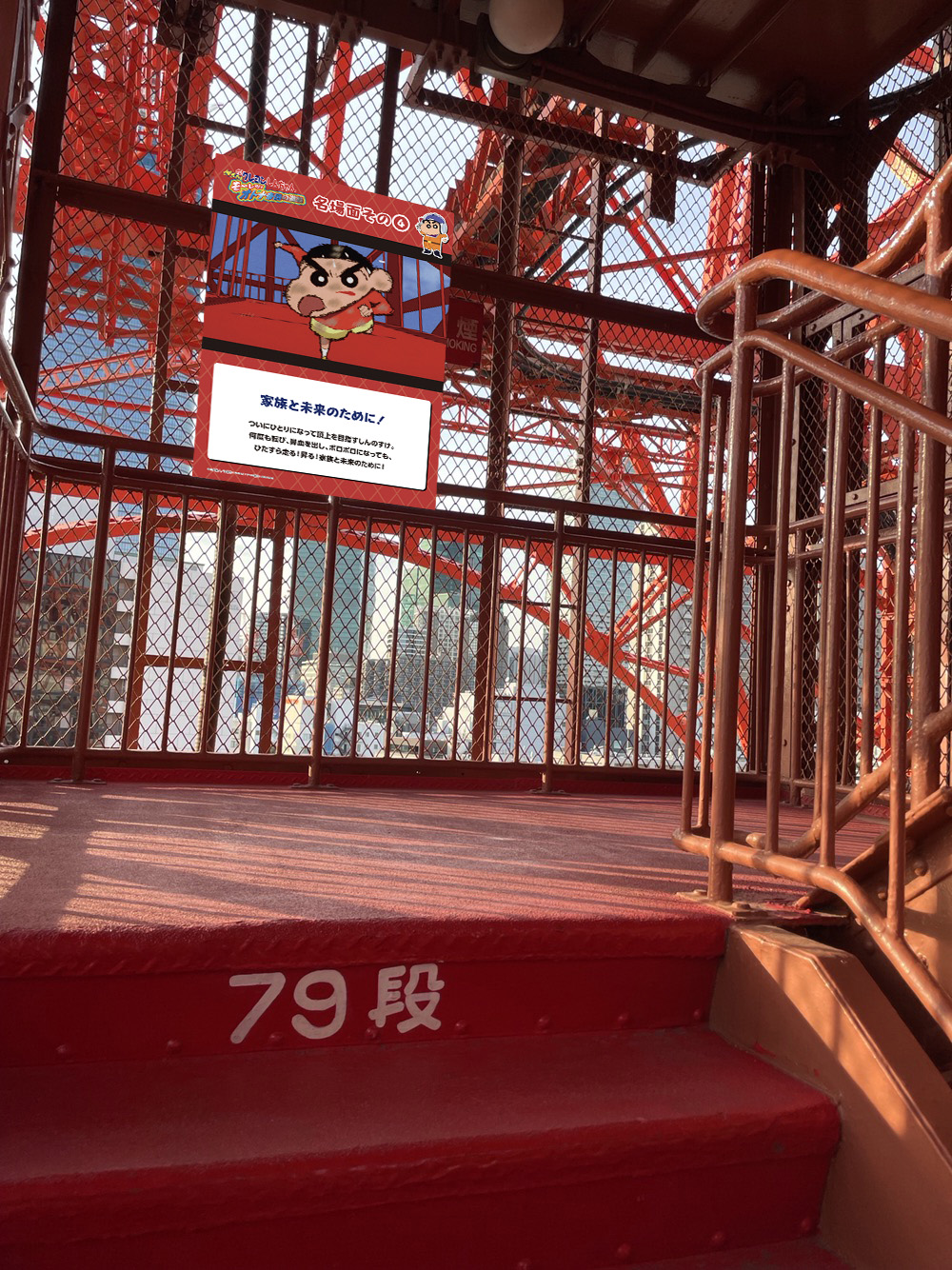 外階段の所々に、「野原しんのすけ」たちが東京タワーの頂上を目指すまでの名シーンを振り返るパネルを設置。