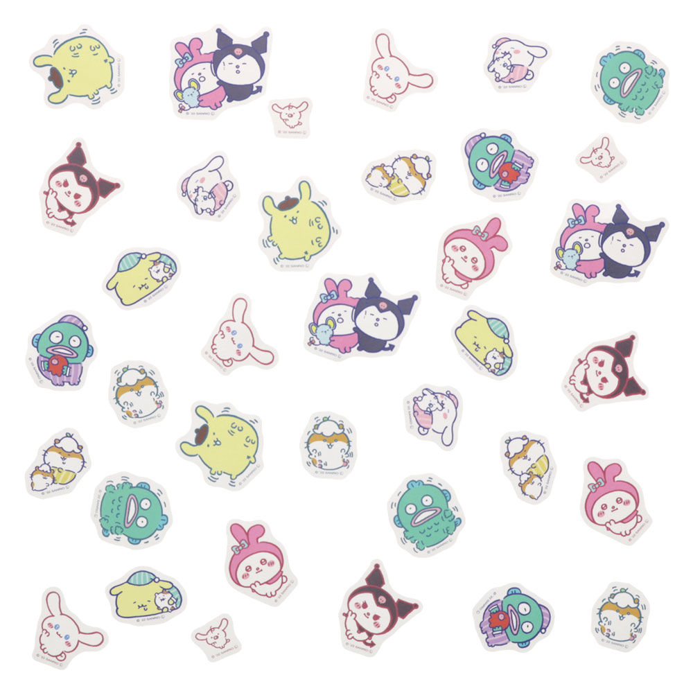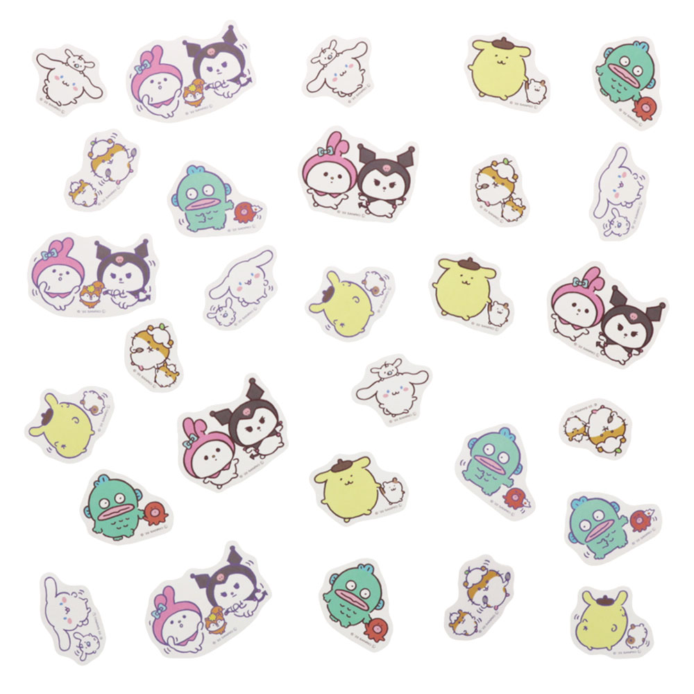 フレークシールは、スライダーケースにプリントされているのと同デザインの「シナモロール」「みるく」「マイメロディ」「クロミ」の4柄と、バタバタと手足を動かしている「ポムポムプリン」「コロコロクリリン」「ハンギョドン」の3柄。
