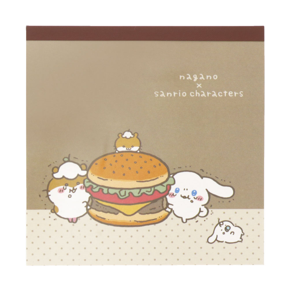 「もぐもぐ」デザインのスクエアメモの表紙には、大きなハンバーガーを食べるサンリオキャラクターズをデザイン!