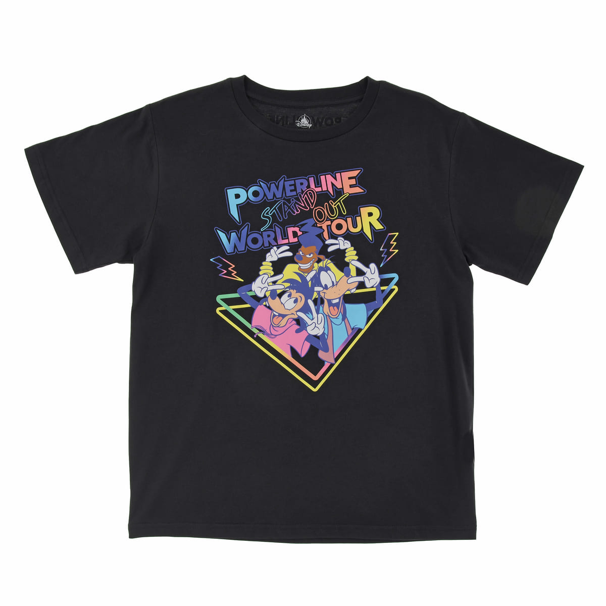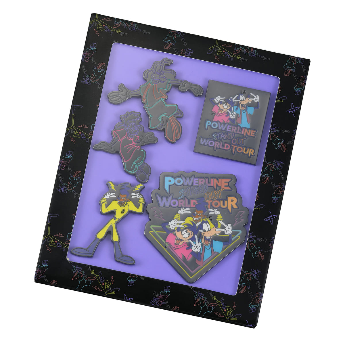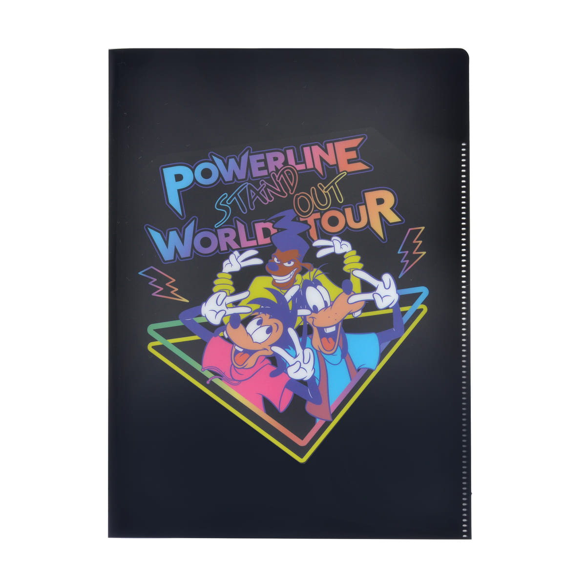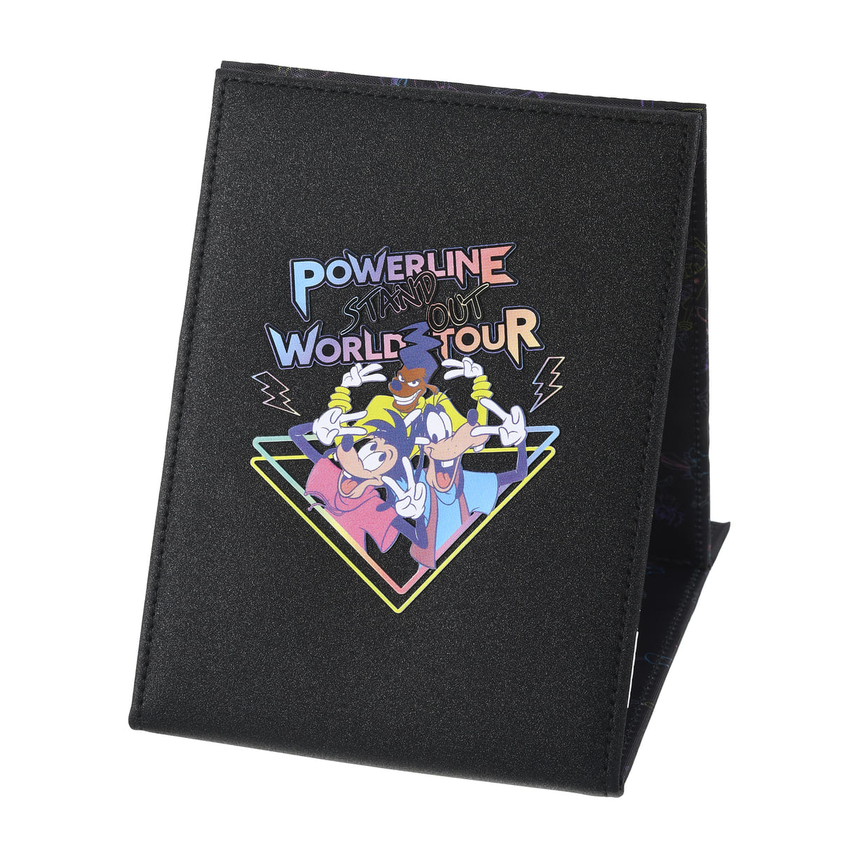 ミラーフレームや内生地にはポーズを決める「パワーライン」と、ライブに飛び入り参加した「グーフィー」と「マックス」がネオンカラーで描かれています!