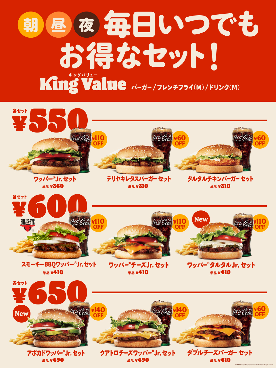 キングバリューは、対象のバーガーとフレンチフライMサイズ、ドリンクMサイズを毎日いつでもお得な価格で楽しめるセットです。