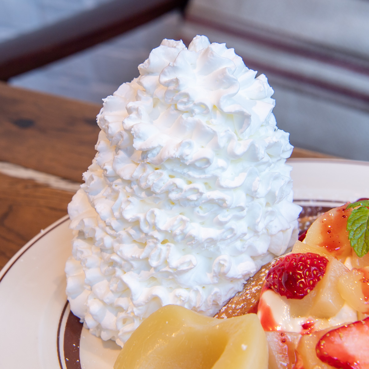 大きな白桃がごろっと乗った、見た目のインパクトも抜群なパンケーキ。