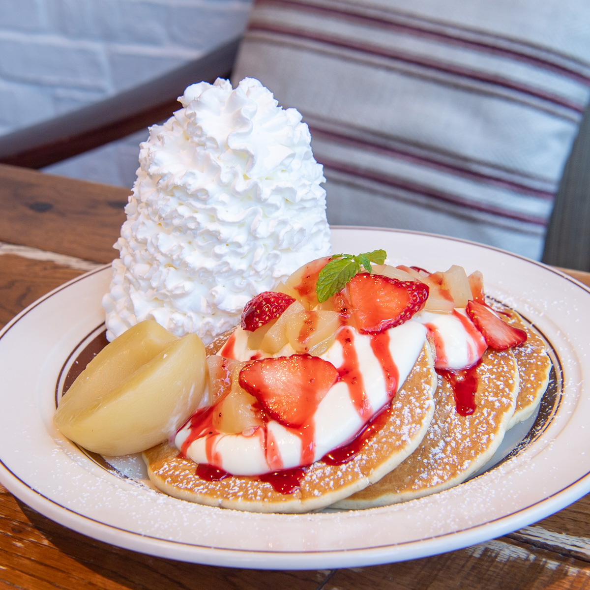 Eggs ’n Things「白桃とイチゴのパンケーキ」