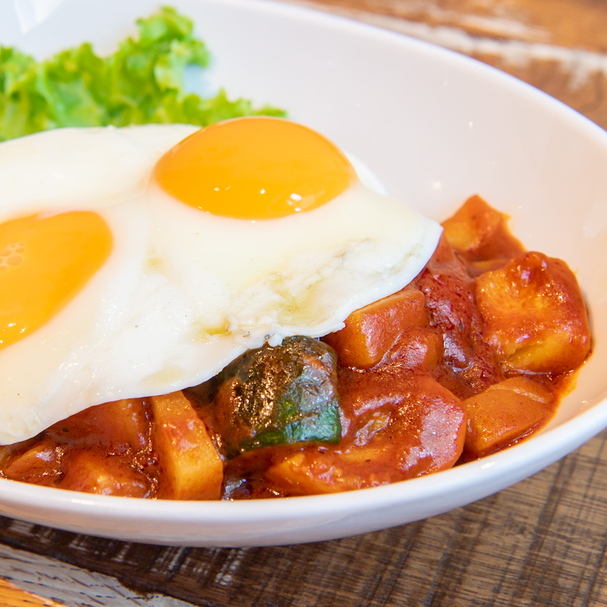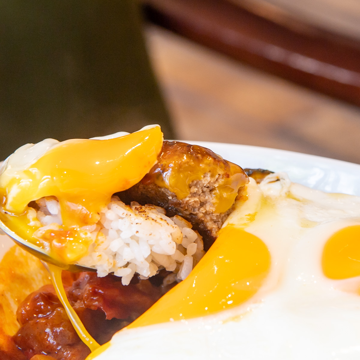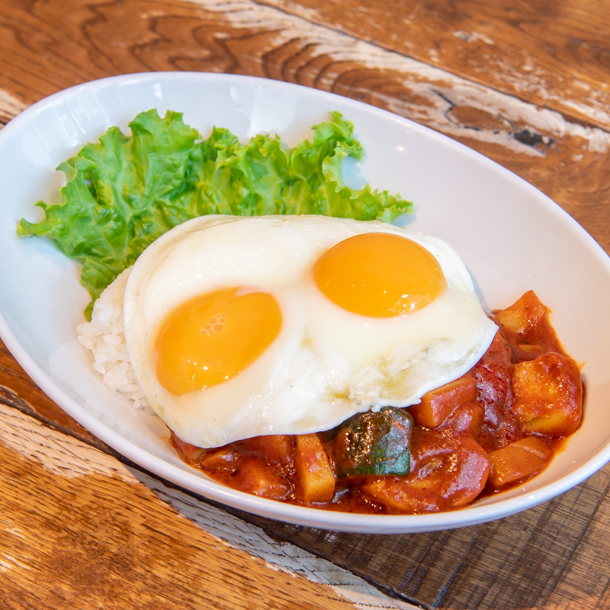 Eggs 'n Things「マサラカレーと桃のロコ・モコ」