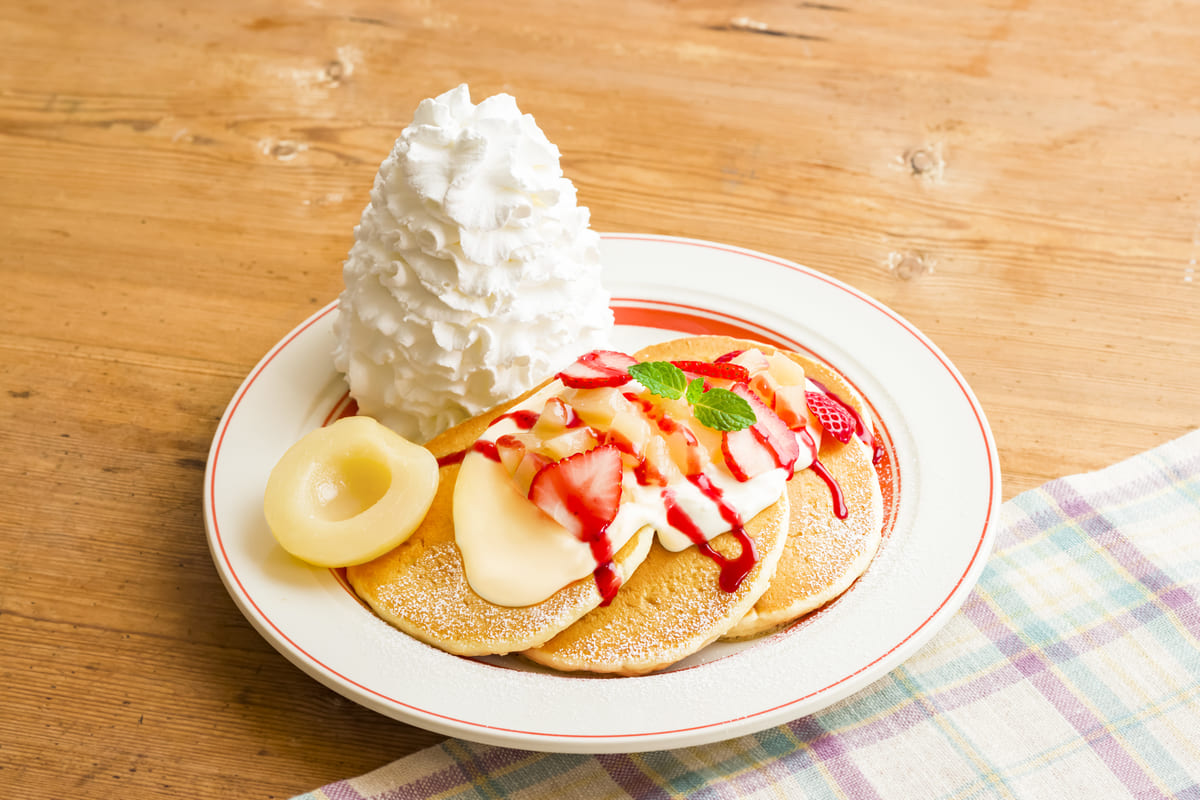 白桃の果肉がたっぷり楽しめる「白桃とイチゴのパンケーキ」