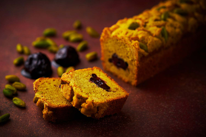 ピスタチオホール、ペースト、パウダーまでふんだんに練り込んだ生地に、赤ワインでじっくり煮詰めたチェリーを入れた贅沢なパウンドケーキです。