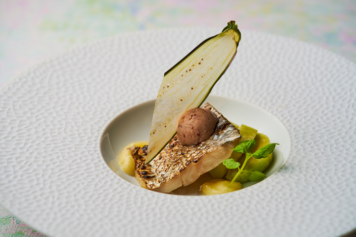 シャキシャキ食感の旬野菜や鮮魚を、夏らしい色合いのソースや風味を味わう「フレンチ×ジャポネ」のディナーコースに仕立てられています。