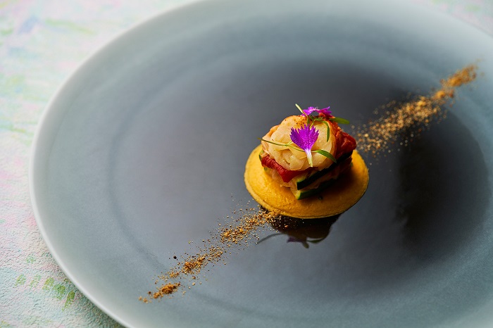 オマール海老をミキュイ(半生)に火入れし、エスニック風味のズッキーニとのミルフィーユのように仕立てられています。