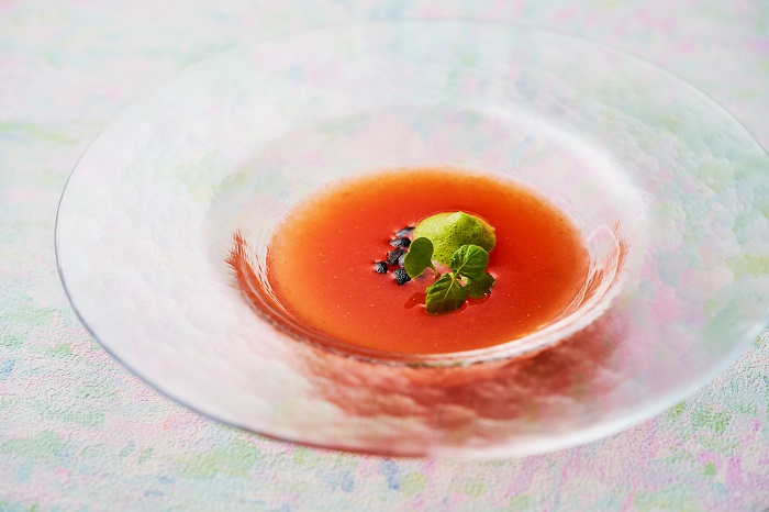 スープは、ほのかな酸味とコクがある完熟トマトを使った「トマトの冷製スープ バジルのエスプーマ」