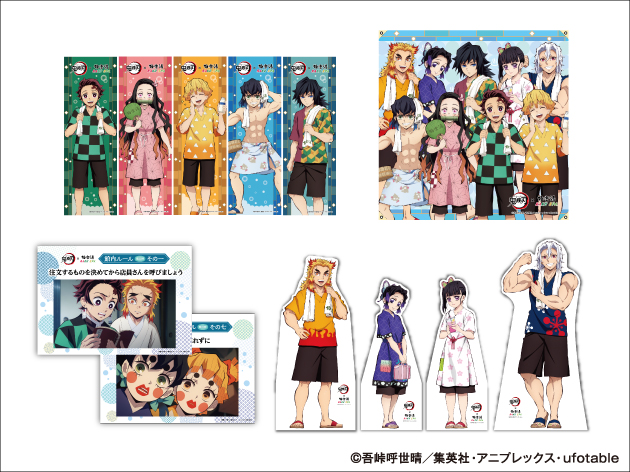 限定手ぬぐいがセットになった「炭治郎たちの極楽な休日セット」などのオリジナルグッズが販売されるほか、コースター特典が付いた期間限定コラボメニューが登場します。