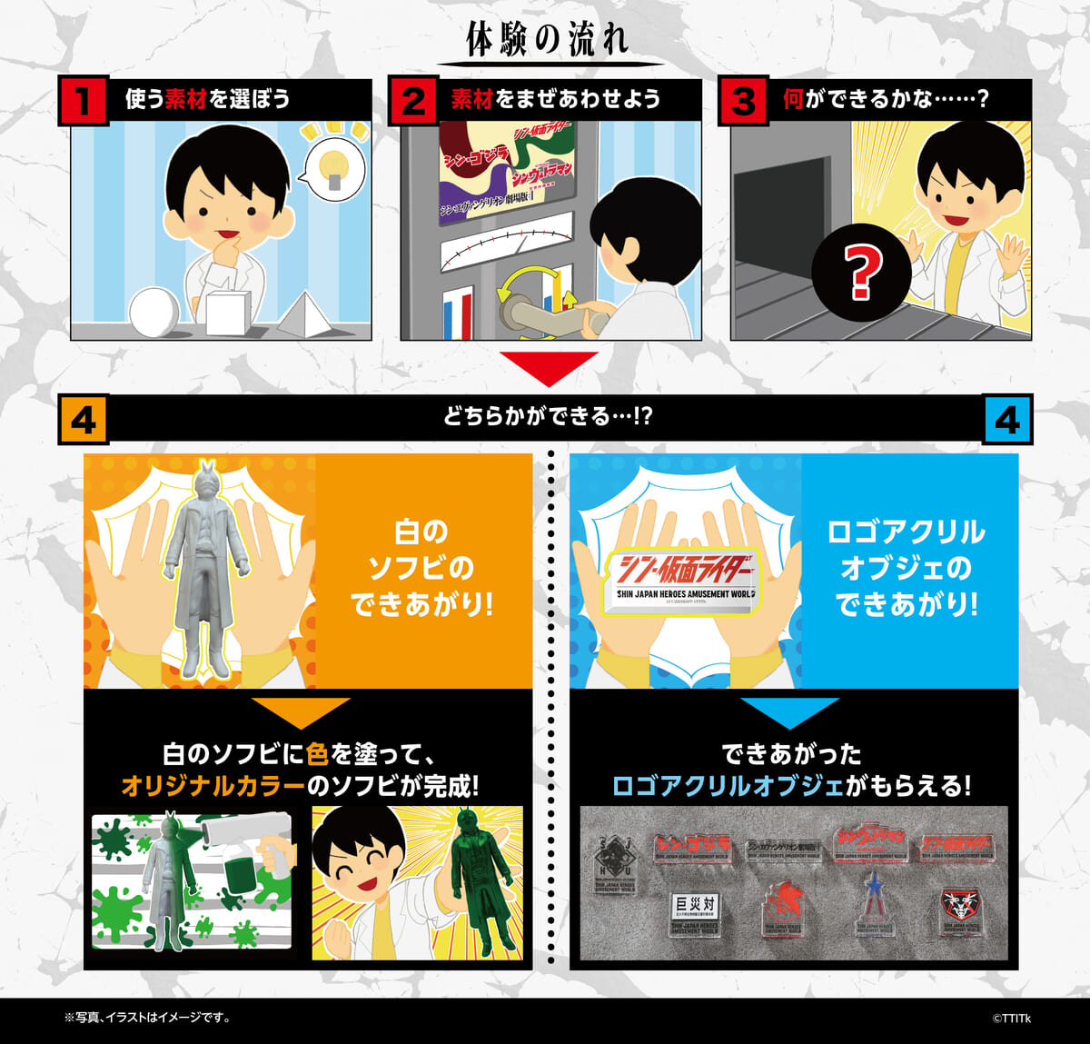 ゲスト自身が選んだ「素材」を専用マシンに投入し混ぜ合わせると、ランダムで「ソフビ賞」または「ロゴアクリルオブジェ賞」の景品が出てきます。